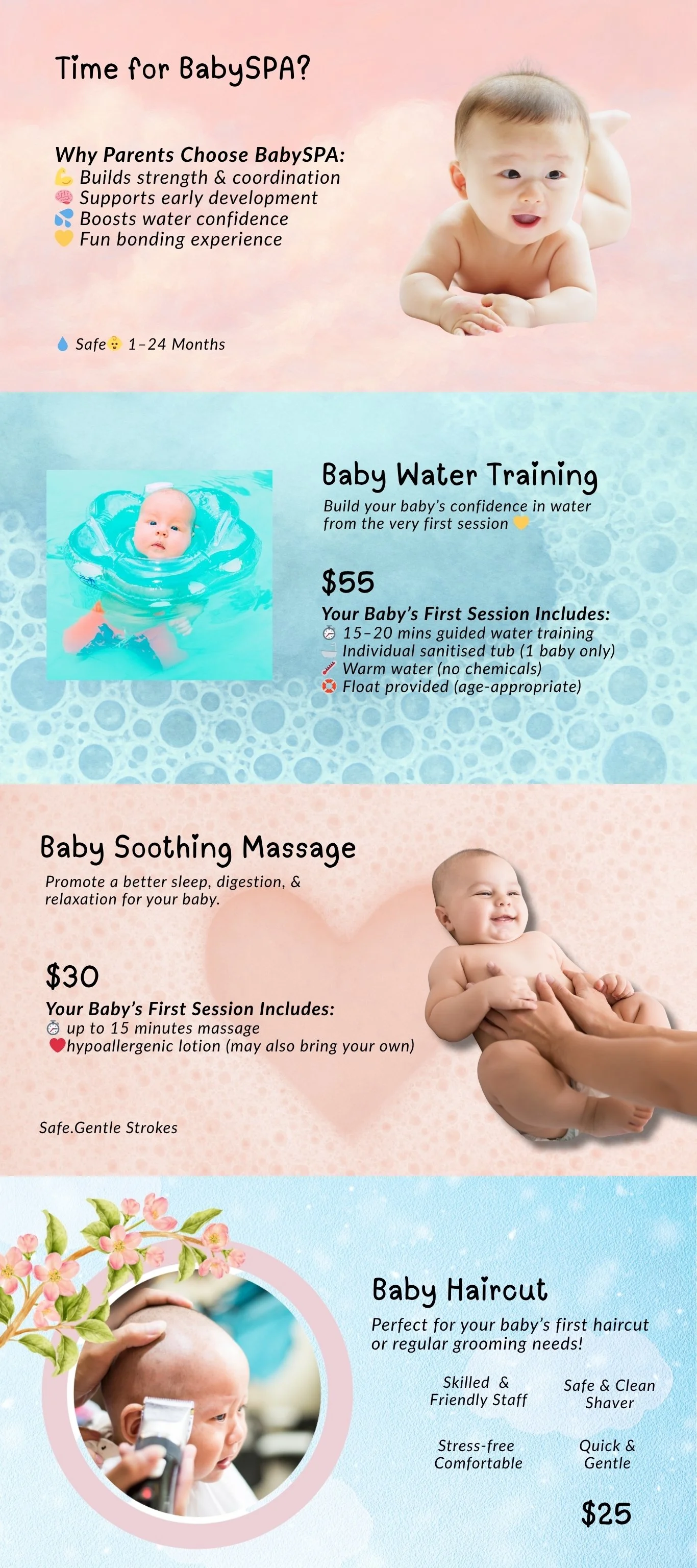 Watch how your baby benefits from early water training, sensory stimulation, and calming massage, all guided by our passionate and professionally trained team. Let’s create lasting memories together. 💙