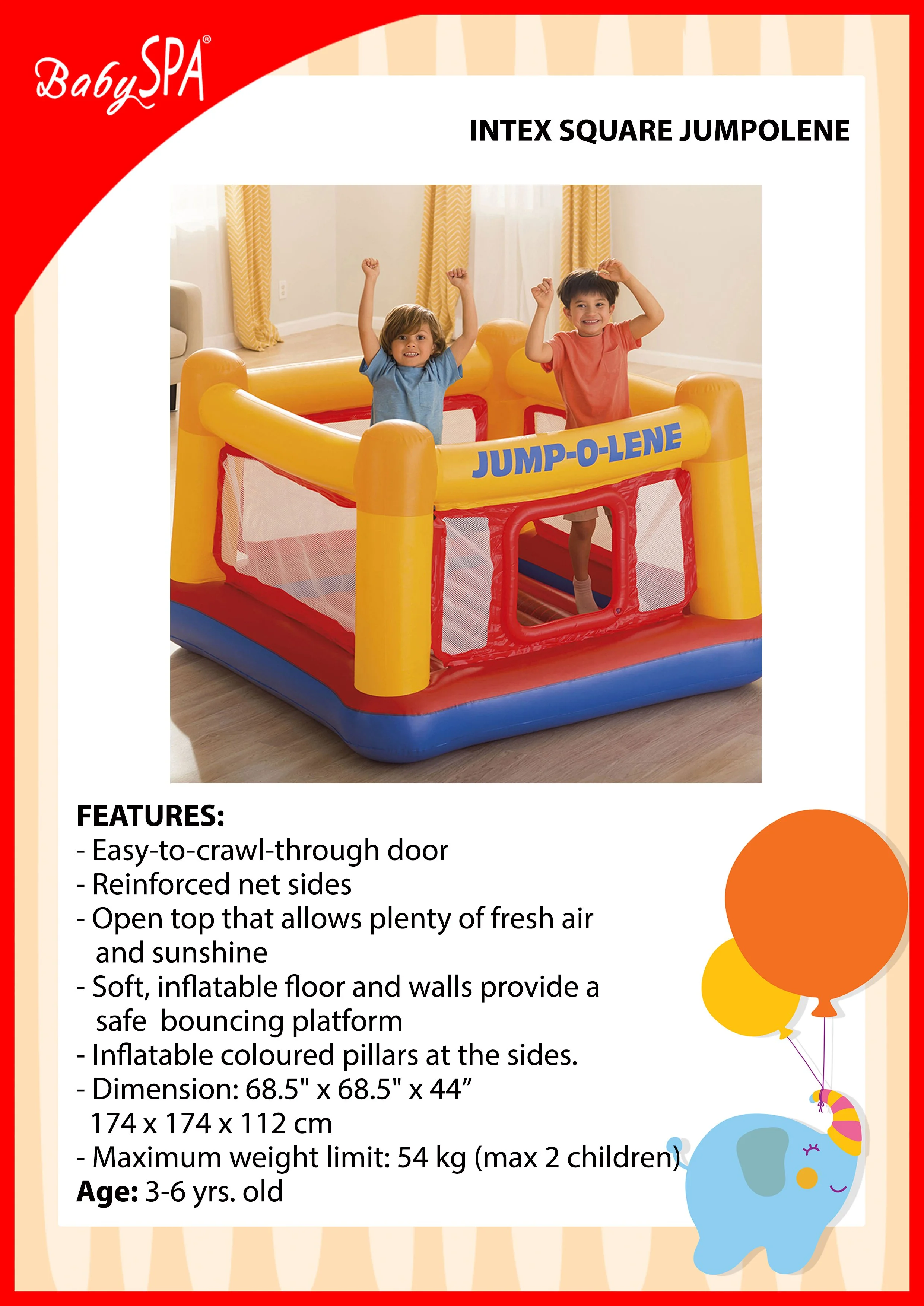 This ultimate inflatable Jumpolene Castle Bouncer combined with an imaginative pretend-Play castle setting Cushion, double-mattress inflatable floor for safe, soft, bouncing fun! Built-in crawl-thru door included so your kids can use this as a playhouse or a big fort! Let your kid’s imaginations soar! it encourages physical development, balance, coordination, and healthy exercise. Featuring high walls and a double mattress inflatable floor, this bouncer is safe and fun!